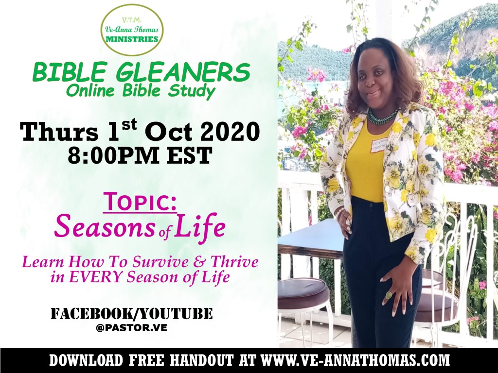 The topic for the next study is “Seasons of Life” on Thursday 1st October 2020. I will be teaching on how to transition from season-to-season and how to survive and thrive in EVERY season of life. As usual, the FREE Bible Study Handout would be available to download from my website, WWW.VE-ANNATHOMAS.COM.