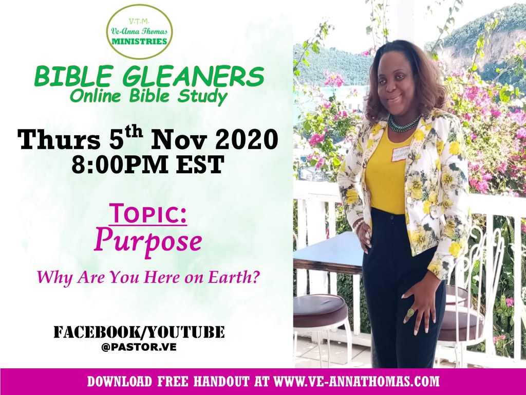 The topic for the next study is “Purpose” on Thursday 5th November 2020. Set Your Alarms! Mark Your Calendars! Grab Your Bible Study Tools! As usual, the FREE Bible Study Handout would be available to download from my website, WWW.VE-ANNATHOMAS.COM.