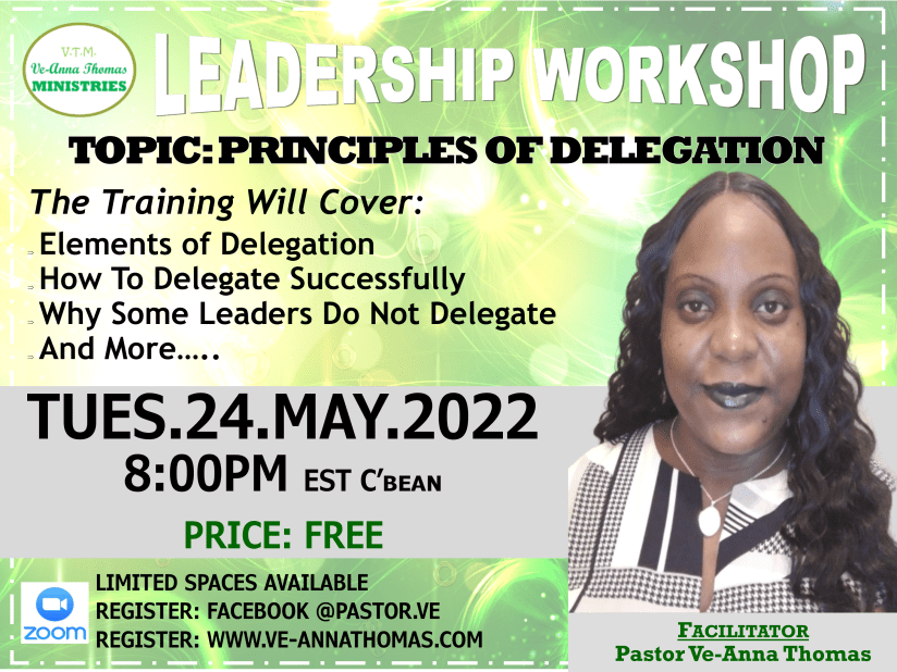 The next workshop is scheduled for Tuesday 24th May 2022 at 8:00PM EST Caribbean Time. The topic is “Principles of Delegation”. As leaders, we cannot do it all by ourselves. We need to build a team of people around us to share the workload. We need to assign tasks and responsibilities. Join me next Tuesday 24th May 2022 at 8:00 p.m. EST Caribbean Time. During the training, we will explore the areas listed on the flyer below: