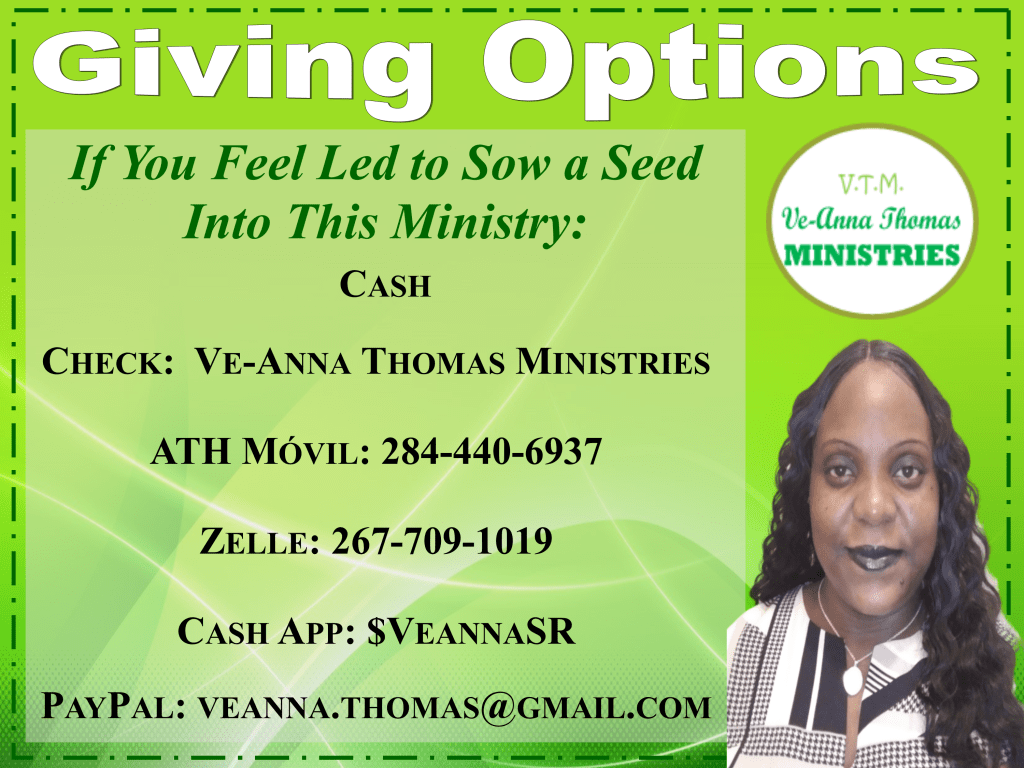 From time to time, persons inquire about sowing a seed into the ministry, the available giving options are listed below. Thank you in advance for your contributions, it is greatly appreciated.