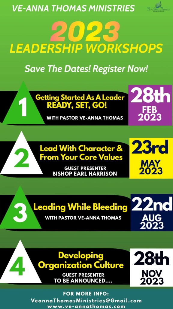 I encourage you to grab this opportunity as you lead in 2023. These sessions are ideal for Pastors, Ministers, Church Board, Church Workers/Volunteers, Non-Profit Organization Leaders, Community Leaders, Business Managers, Supervisors and other interested persons. Send all inquiries via email to VeannaThomasMinistries@Gmail.com or WhatsApp 284-544-6937.