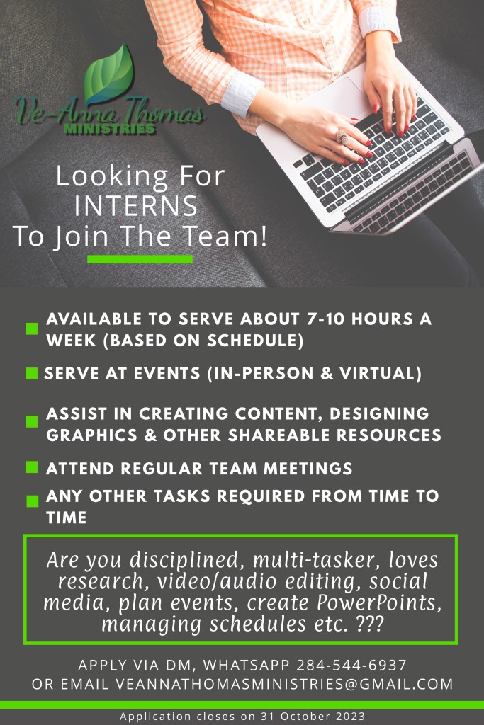 Ve-Anna Thomas Ministries is growing and I am looking to add a few talented and amazing individuals to the team via an internship program. The role gives the individual the opportunity to utilize their creative skills to learn, observe, grow and serve in various areas of kingdom and ministry work. Contact me if you are interested.