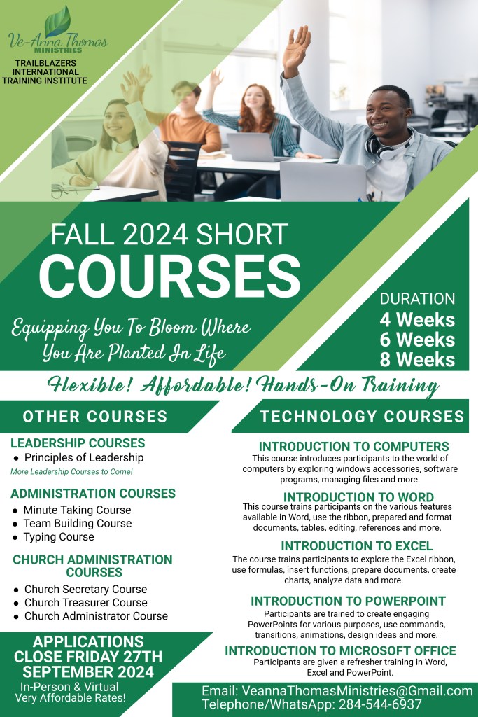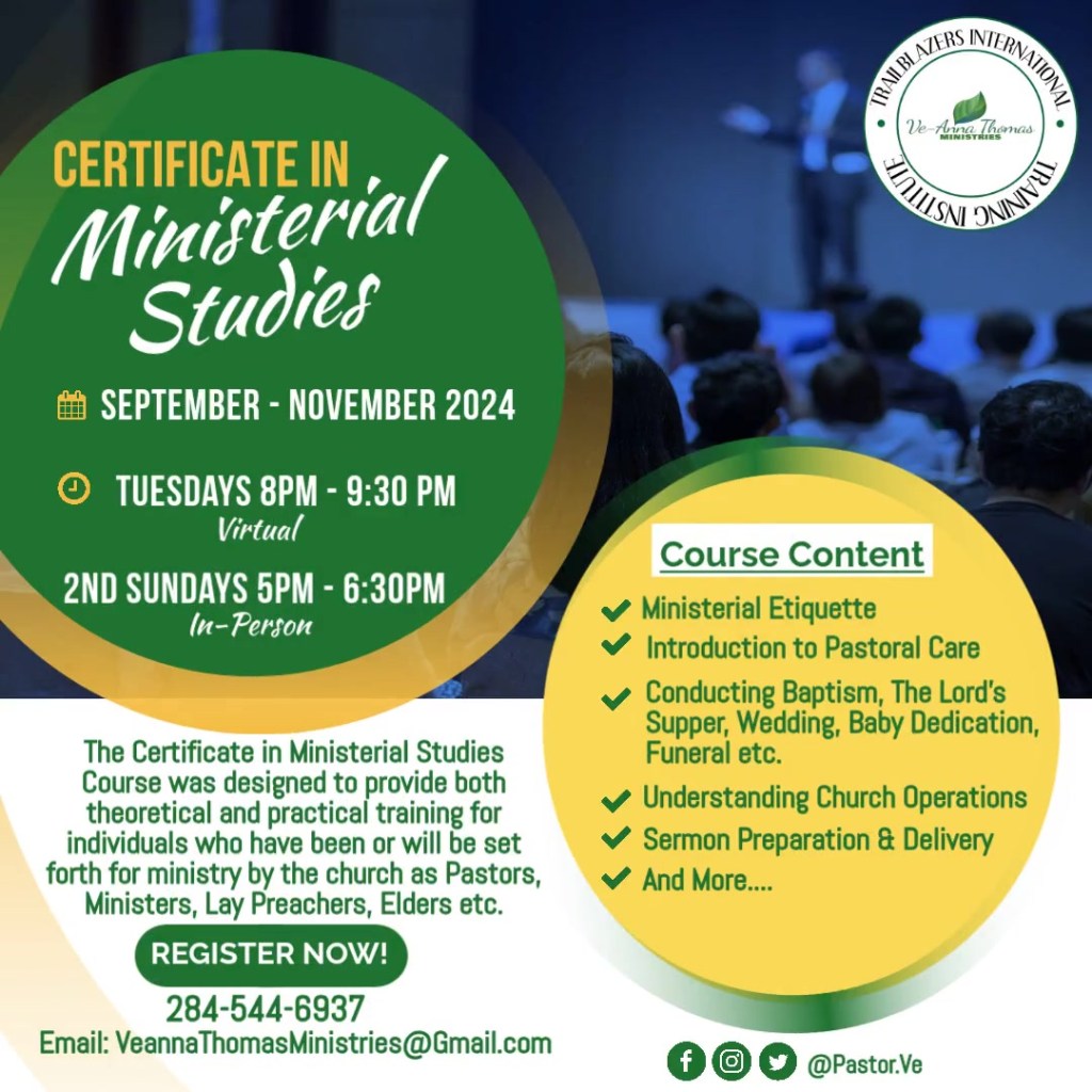 I encourage you to grab this opportunity as you lead in 2024. These sessions are ideal for Pastors, Ministers, Church Board, Church Workers/Volunteers, Non-Profit Organization Leaders, Community Leaders, Business Managers, Supervisors and other interested persons. Send all inquiries via email to VeannaThomasMinistries@Gmail.com or WhatsApp 284-544-6937.