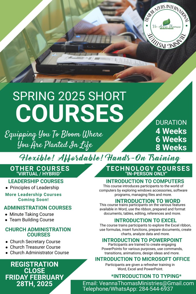 Classes for the Spring Semester are scheduled to begin early March and graduation is scheduled for June. Registration has been extended to Friday February 28th, 2025 at 11:59 p.m. Please see the flyer below for the courses offered for this Semester: