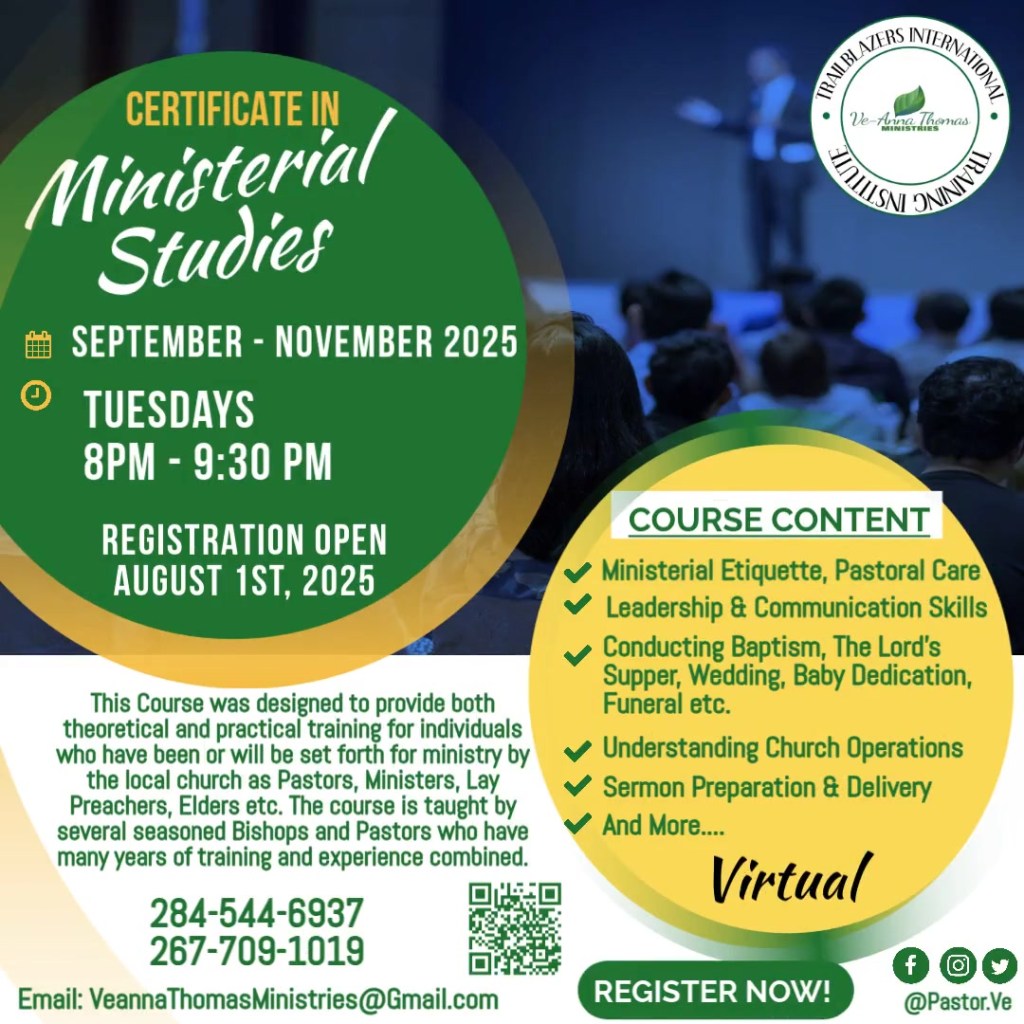 The Trailblazers International Training Institute (under Ve-Anna Thomas Ministries) launched in January 2024 provide training in 3 focus areas: Leadership, Administration (including Church Administration) and Technology.