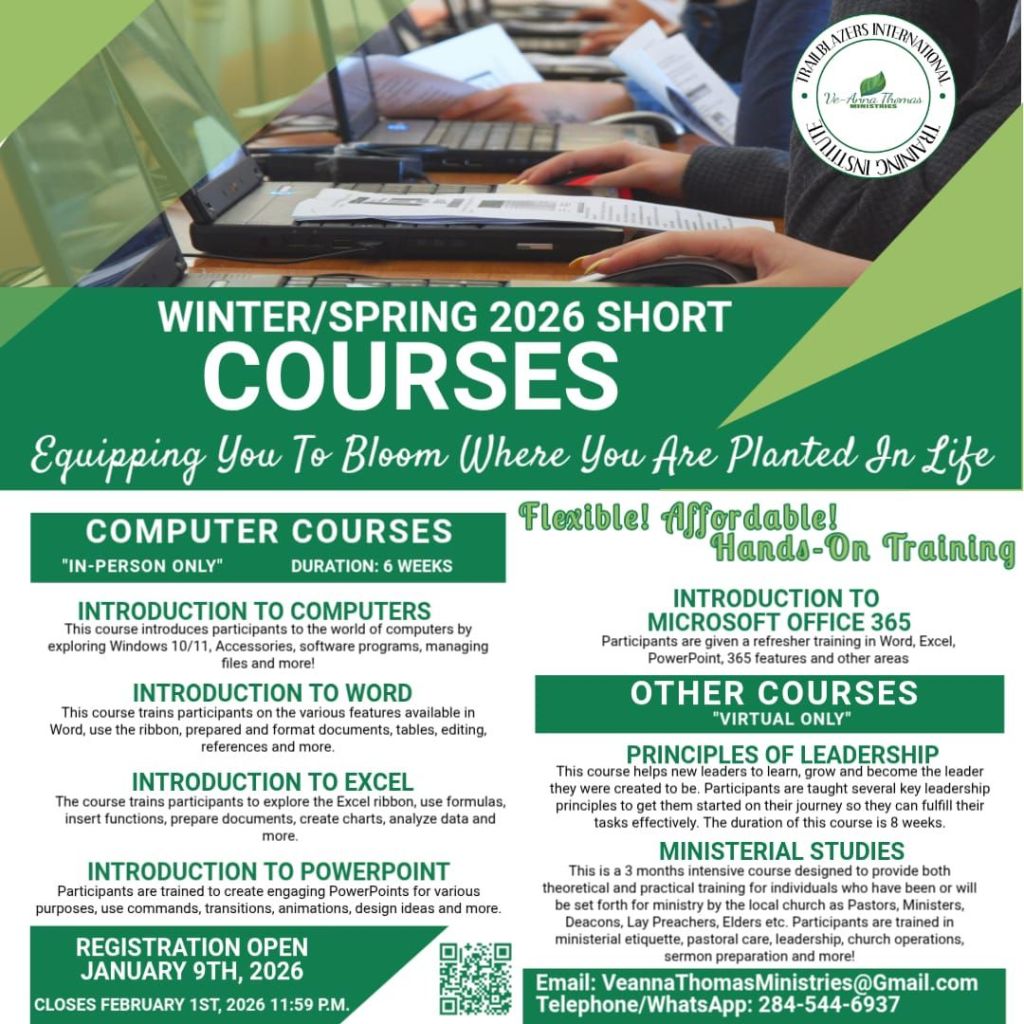 The Trailblazers International Training Institute (under Ve-Anna Thomas Ministries) was launched to provide training in 3 focus areas: Leadership, Administration (including Church Administration) and Technology. Since the inception in January 2024, the Institute graduated a total number of 17 students in 2024.